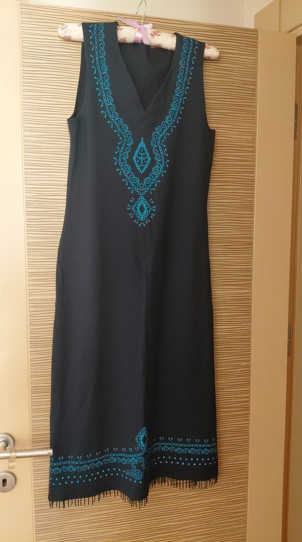 V yaka, kolsuz, turkuaz işlemeli ve boncuklu detaylara sahip, yumuşak sentetik kumaştan yapılmış, regular fit uzun elbise. penye kumaş rahat ve şık bir elbise.