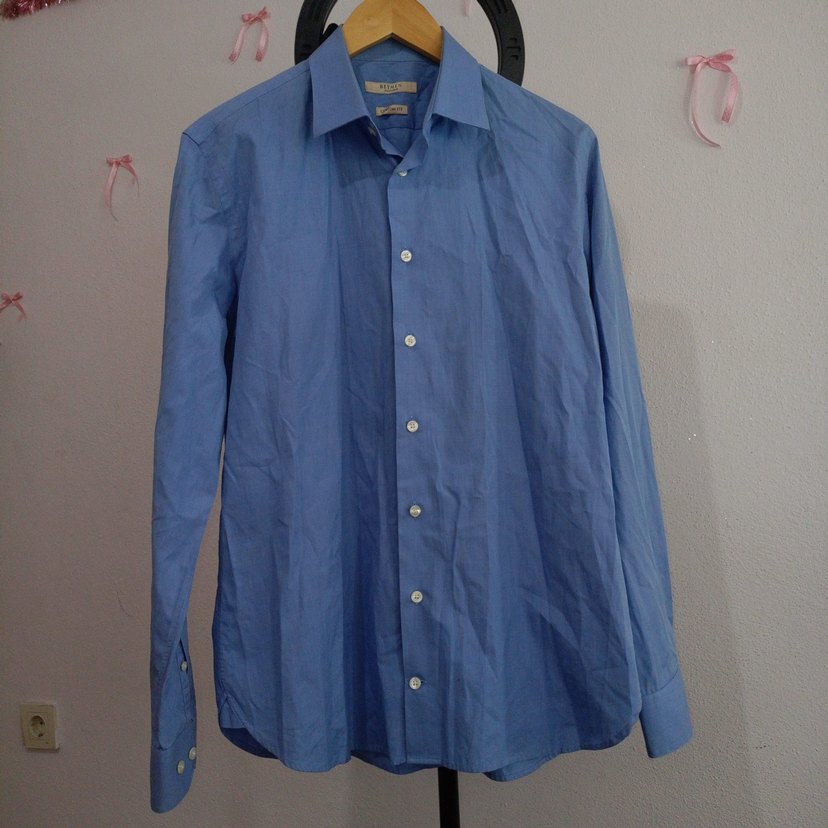 Mavi renkte, keten kumaştan üretilmiş, düğmeli ve yakalı erkek gömleği. Normal kesim ve uzun kolludur, iş veya günlük kullanıma uygundur. ✨