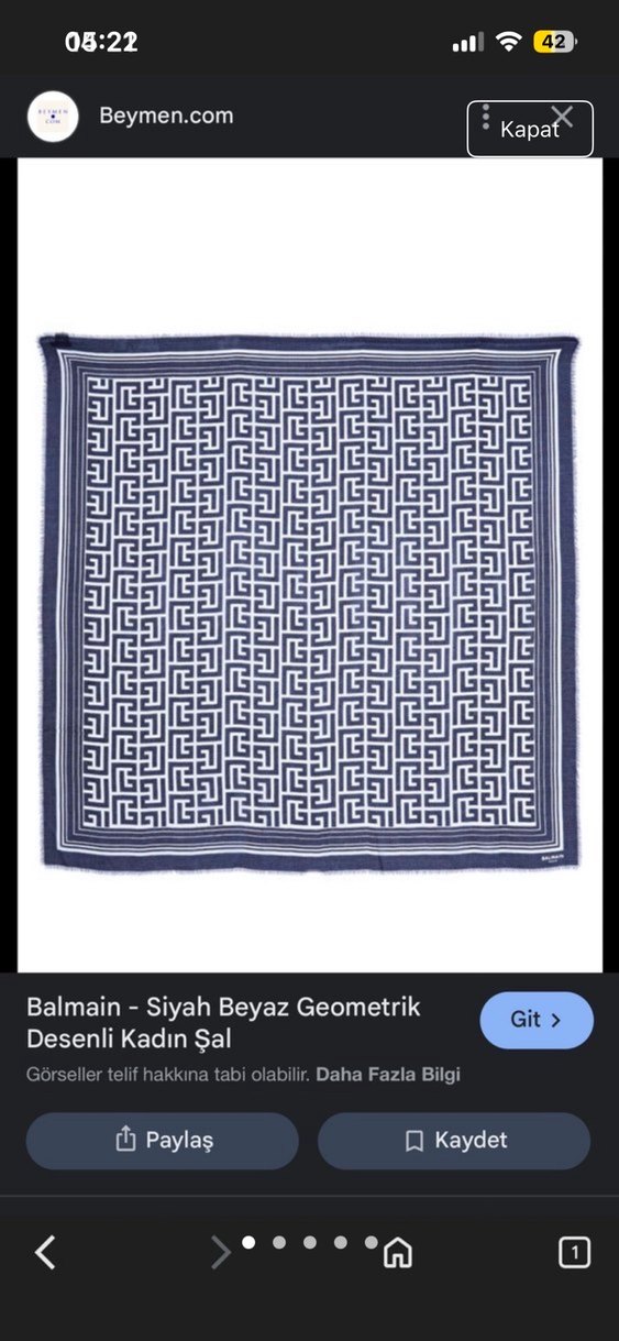 Balmain markalı koyu mavi, geometrik desenli, pileli ve klasik tarzda kadın şalı. Mütevazı Paris tarzını yansıtır.