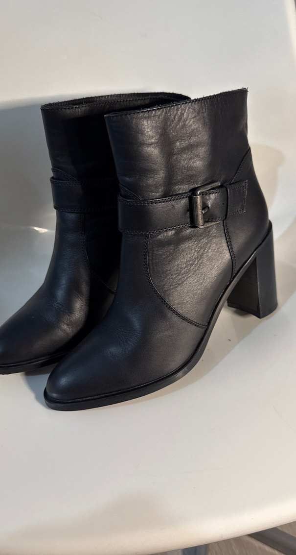 Siyah deri tokalı kadın botları, kalın topuklu ve klasik biker tarzında, günlük kullanıma uygun. Orijinal bot çok eskiden alındı yumuşak derili ayakkabının altında etiketleri mevcut temiz kullanıldı yaklaşık 7cm topuğu var