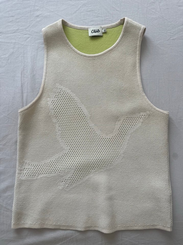 Bej renkli, örgü dokulu kolsuz , bisiklet yaka ve kuş desenli defosu yoktur
