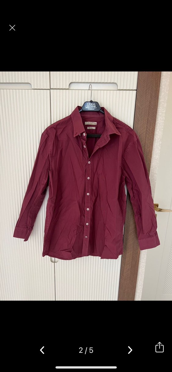 Uzun kollu, yakalı ve düğmeli bordo erkek keten gömlek. Normal boy ve rahat kesime sahip, ofis kullanımı için uygundur.