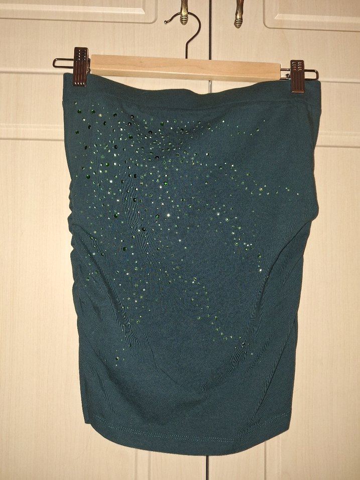 Amisu marka XS beden likralı koyu yeşil renk straplez abiye bluz. Göğüs yarıda ölçü 34 beden, lastikli, esneyince 45 cm e geliyor.Ön ortadan boy 43 cm. Ön içte ayrıca göğüs tutucu parça var. Yanlarda lastikle drape verilmiş. Defosu yok, temiz ürün. Bir kez giyilmiştir. Marka temsilidor.