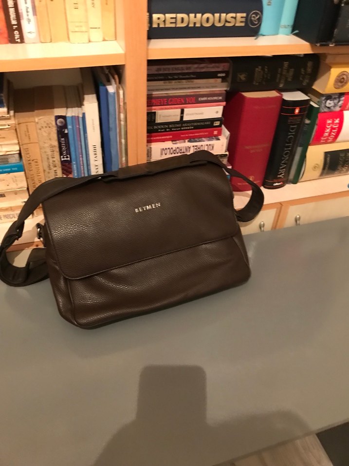 Koyu kahverengi deri postacı çanta, kullanıldı ama hiçbir sorunu yok.