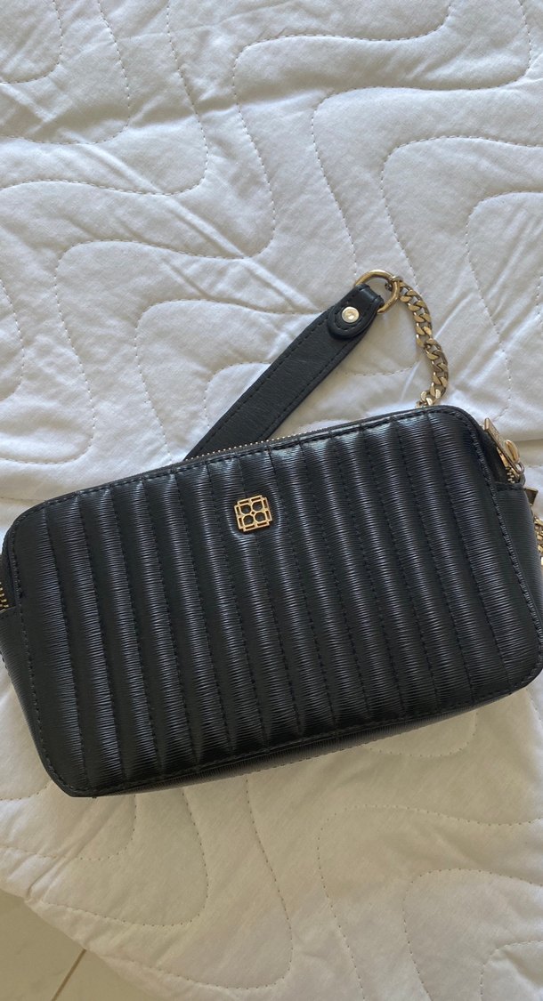 Siyah deri kadın çanta, fermuarlı kapama ve ince kapitone deseni ile modern klasik tarzda. Zincirlerinde renk değişimi var uzun süre kulladm. İç astarında leke ve sökülmeler var