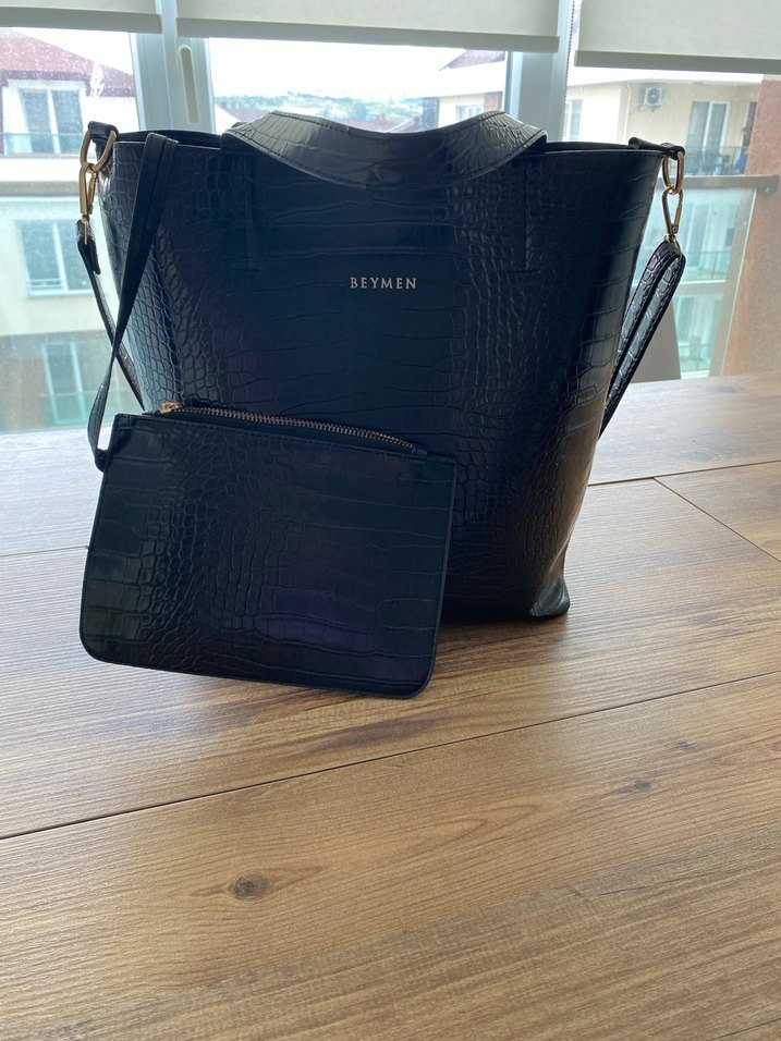Beymen markalı siyah deri yılan desenli çanta, tokalı detaylıdır ve şık günlük kullanım için uygundur. Yanında uyumlu küçük çanta bulunur. Ürün replikadır