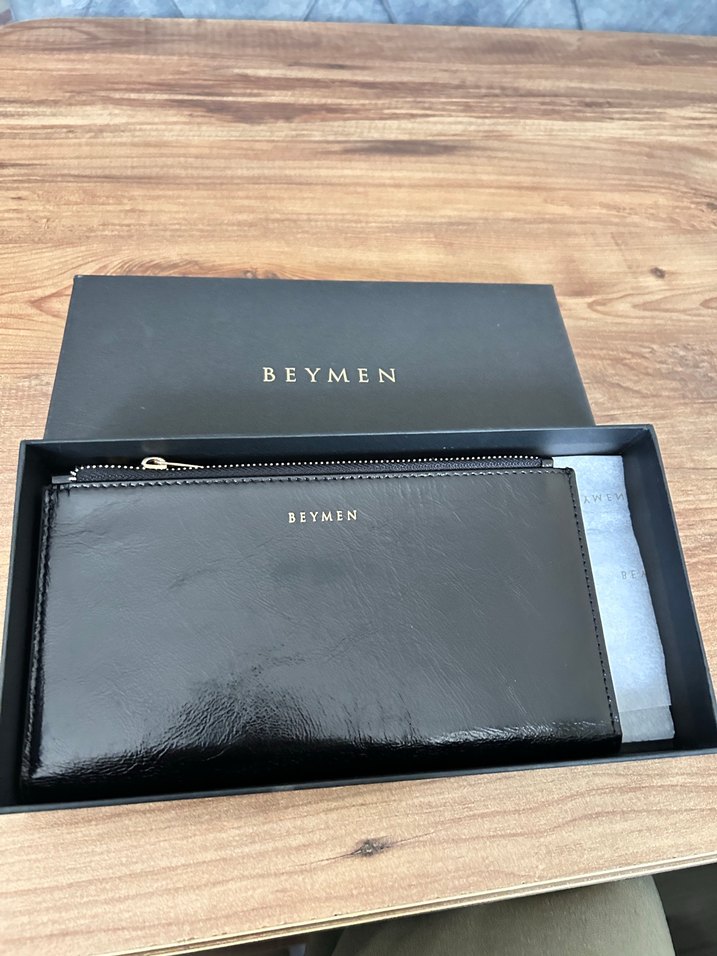 BEYMEN siyah kadın deri cüzdan, parlak deri ve baskılı desene sahip, fermuarlı bölümü ile ofis kullanımı için uygundur, çağdaş klasik zarafet stilinde.