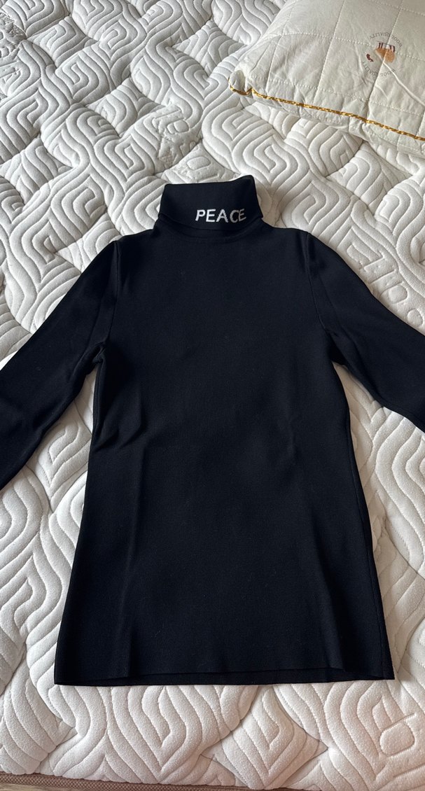 Bu siyah, dar kesim kadın kazağın boğaz kısmında "PEACE" yazısı bulunur. Uzun kollu ve yumuşak, sıcak tutan kumaştan yapılmıştır. Rahat sokak stili için uygundur. Boyu 58 cm eni 33 cm dar kesim orjinal bir kaç kere giyildi