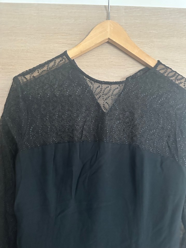 Üst kısmı dantel detaylı, uzun kollu, V yaka ve bol kesim siyah kadın bluz. Günlük kullanım için uygun, gotik ve bohem tarzda.