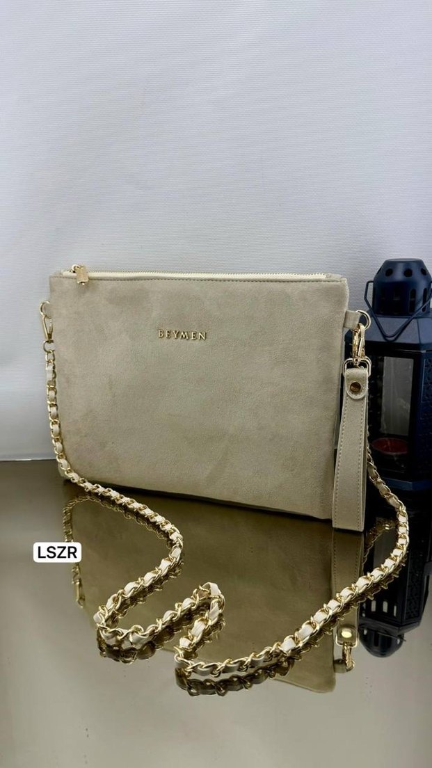 Bej süet kadın çanta, zincir detaylı ve hafif yılan derisi deseniyle. Minimalist, modern klasik tarzda, günlük kullanıma uygun. Önünde BEYMEN yazısı ve fermuarlı kapama bulunur.
