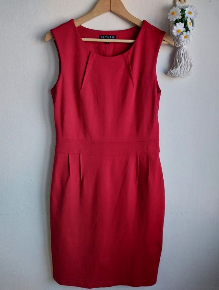 orjinal üründür. fotoğraflardan daha koyu kırmızı tonda. %65 suni ipekten, esneyebilen bir kumaşı var. çok temiz kullanıldı.solması,lekesi,söküğü yok beymen kalitesiyle uzun süre daha giyilir. kol altları arası 45 cm, boy 102 cm