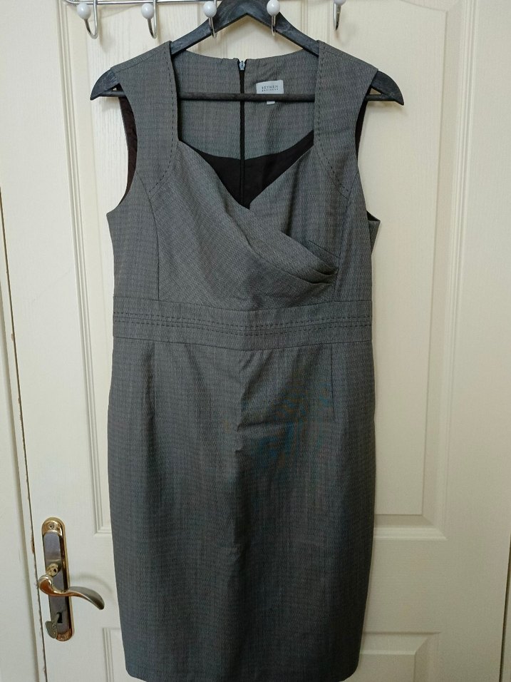 Kolsuz, V yakalı, kemerli gri keten midi elbise. Ofis, davet, günlük için uygun, düzenli kesim ve çağdaş tarz sunar. İki koltuk altı arası uzunluk 46 cm Koltuk altından itibaren etek uzunluğu 75 cm