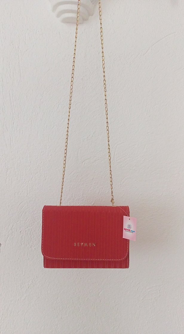 Beymen markalı kırmızı baskılı sentetik kumaş kadın çanta, zincir askılı, trend sokak stili için uygun.
