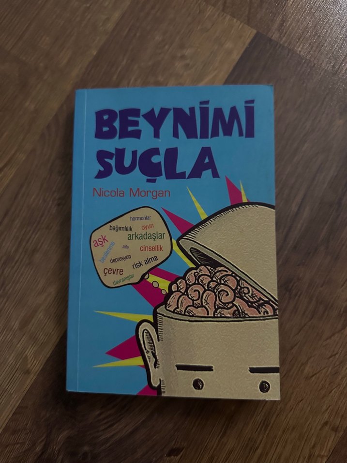 Nicola Morgan'ın "Beynimi Suçla" kitabı, çevre, bağımlılık, arkadaşlık, aşk ve risk alma gibi konuları mizahi bir dille ele alıyor. Kitap kapağında beynin çizimi yer alıyor.