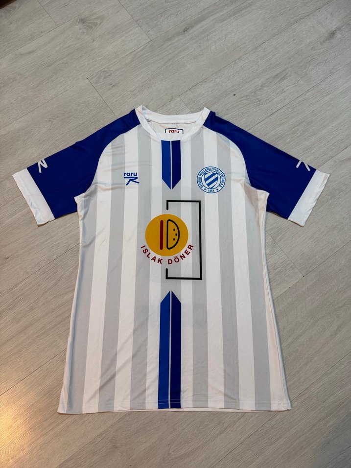 Erkekler için kısa kollu, yuvarlak yakalı, düğmeli beyaz ve mavi baskılı forma. Rahat kesimli ve sentetik kumaştan üretilmiştir. ⚽