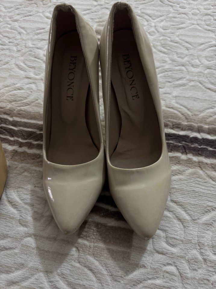 Beyonce markalı beyaz stiletto topuklu kadın ayakkabı, düz desensiz, tokalı ve lastik malzemeden, ofis kullanımı için uygundur.