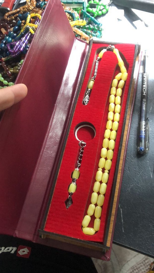 Beyrut damla erkek tesbih seti, kırmızı kutuda sunulmuştur. Anahtarlık aksesuarı da tesbihle uyumludur.