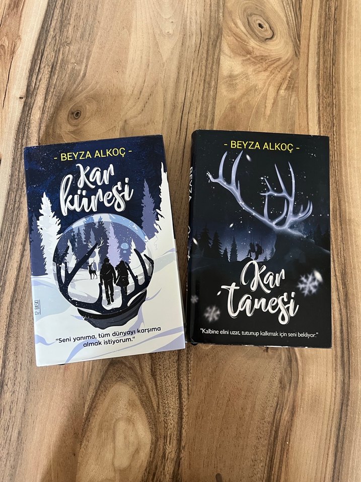 Beyza Alkoç'un 'Kar Küresi' ve 'Kar Tanesi' romanları, kış temalı kapakları ve karla kaplı orman sahneleriyle dikkat çekiyor.