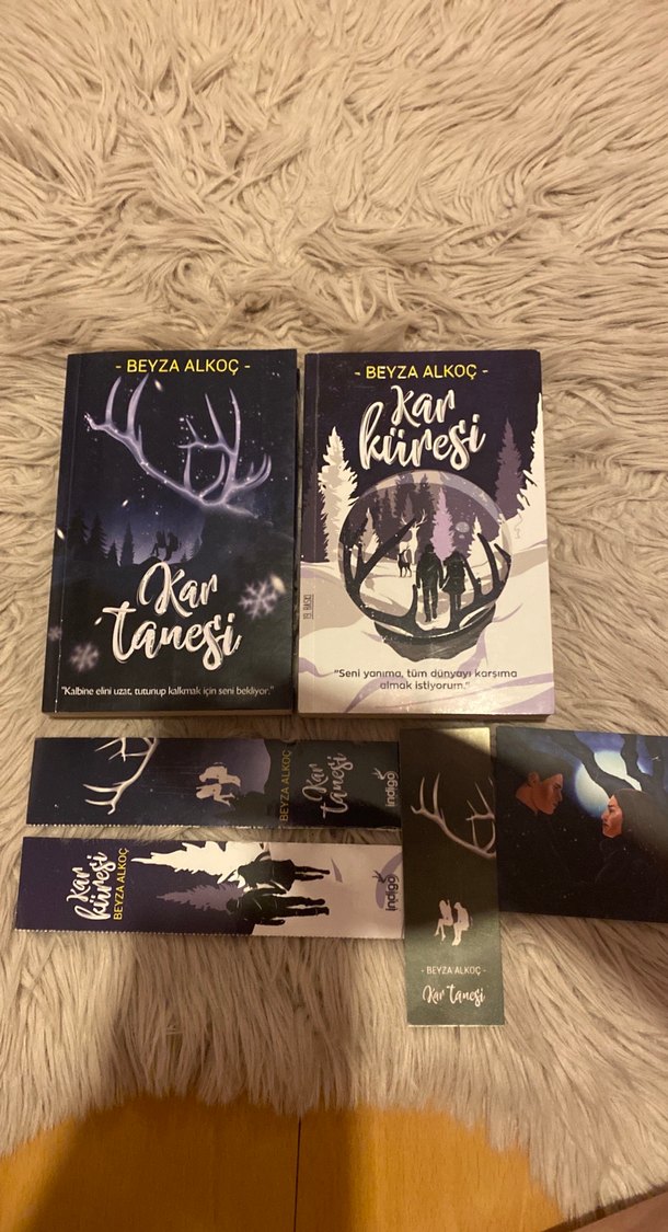 Beyza Alkoç'un 'Kar Tanesi' ve 'Kar Küresi' romanları. İki kitabında ayraçları var. Posteri de var. Kitapda çizili satır yok.