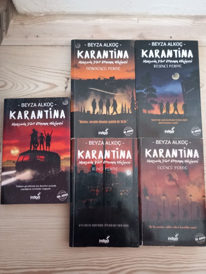 Beyza Alkoç'un Karantina adlı roman serisinden üçüncü, dördüncü ve beşinci kitapları içeren toplam beş kitaplık set. Gizemli kapak tasarımları dikkat çekiyor.