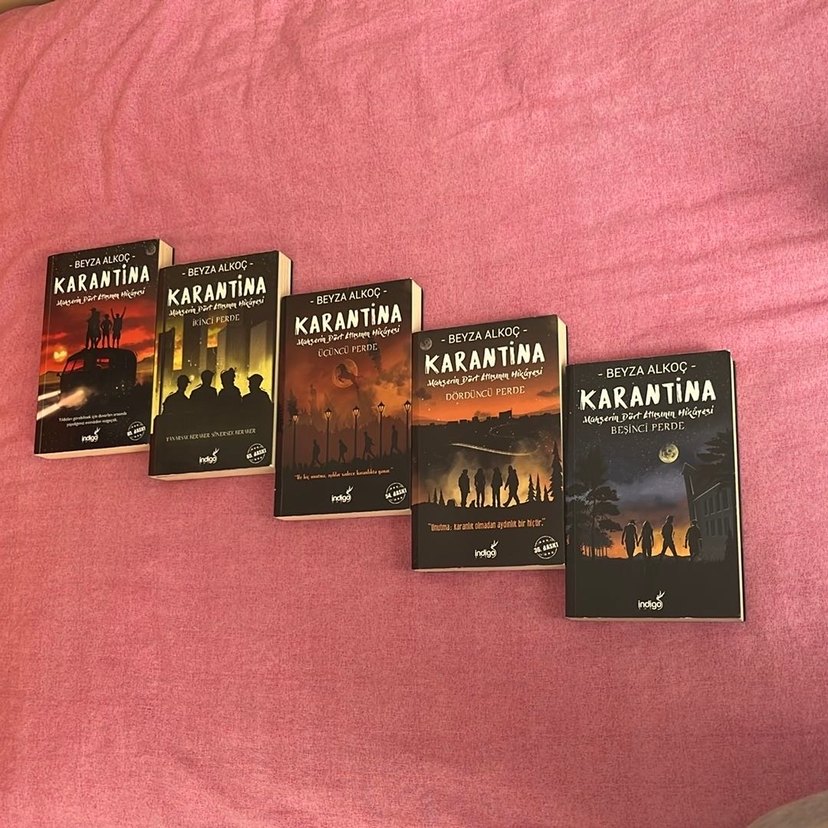 Beyza Alkoç'un 'Karantina' adlı roman serisi, farklı bölümlerle sürükleyici bir hikaye anlatıyor. Kapaklarda silüetler ve dramatik arka planlar yer alıyor . TANESİ 290