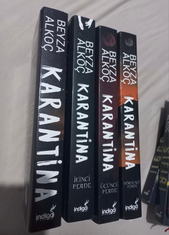 Beyza Alkoç'un Karantina roman serisi, dört ciltten oluşur: Perde, İkinci Perde, Üçüncü Perde ve Dördüncü Perde, Indigo yayınevinden. Ayrı ayrı da satışını yapabilirim 0/3391 km serisi ile birlikte alımda indirim yaparım