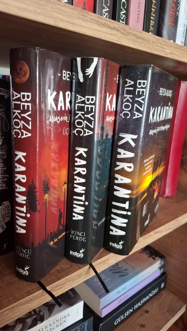 Beyza Alkoç'un 'Karantina' adlı üç ciltlik roman serisi, gece ve gün batımı temalı kapaklara sahiptir.