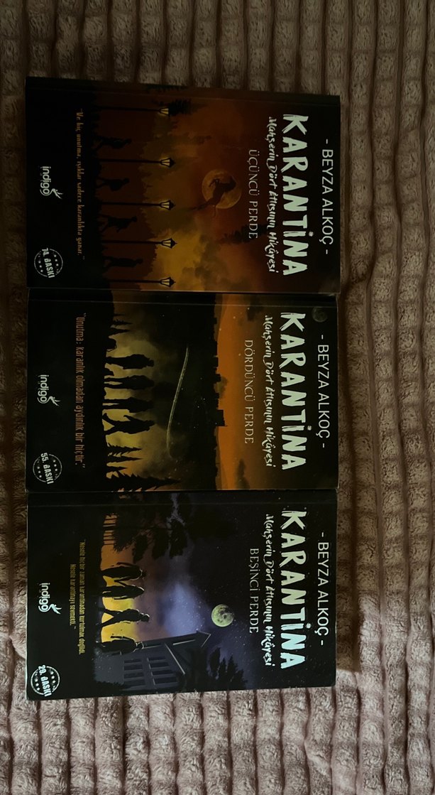 Beyza Alkoç'un Karantina serisi, Indigo yayınevinden Üçüncü, Dördüncü ve Beşinci Perde romanlarını içerir.