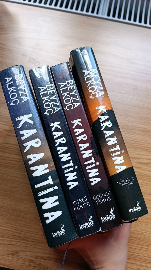 1 ve 4. perdesi ciltli 2 ve 3. perdesi ciltsizdir. Temiz kullanıldı.Beyza Alkoç'un 'Karantina' serisinden dört roman. İlk, ikinci ve üçüncü perde kitapları Indigo yayınevinden. Seriyi tamamlayan bir set.