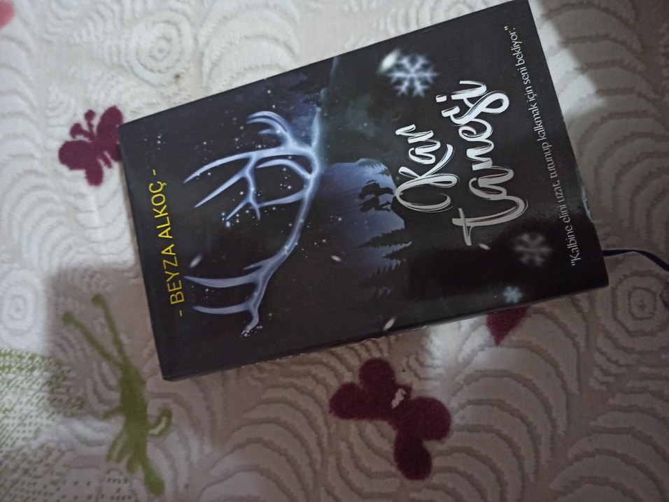 Beyza Alkoç'un "Kar tanesi" romanı, karanlık ve gizemli bir kapak tasarımına sahip, parlayan boynuzlar ve kar taneleri bulunuyor.