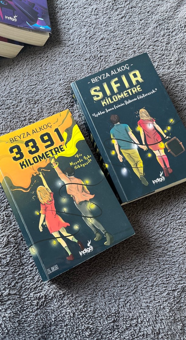 Gayet iyi durumda yırtık yıpranma falan yok temiz kullanıldı Beyza Alkoç'un '3391 Kilometre' ve 'Sıfır Kilometre' adlı romanları, kapakta birlikte yürüyen karakterlerin illüstrasyonları yer alıyor. Indigo yayınevi.