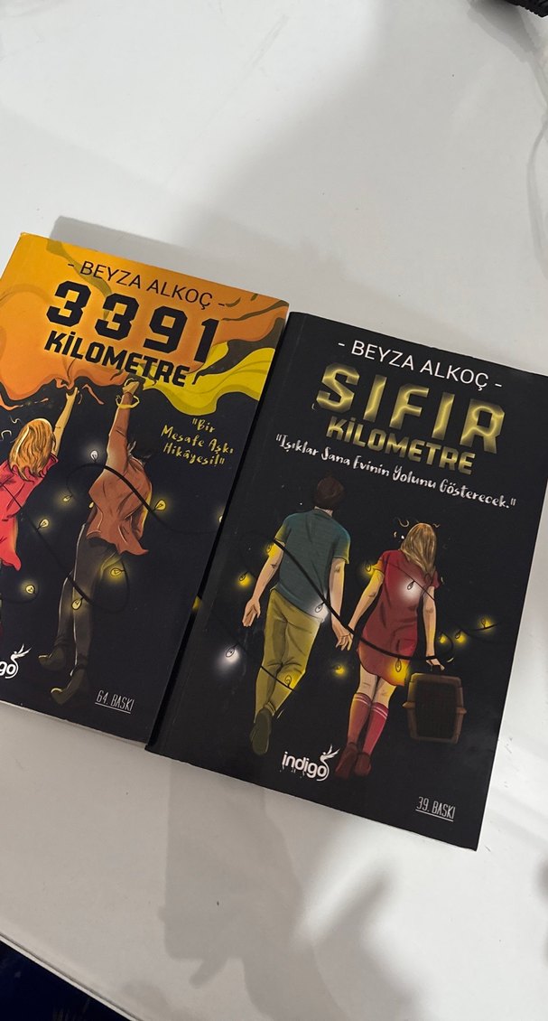 Beyza Alkoç'un '3391 Kilometre' ve 'Sıfır Kilometre' adlı iki romanı, kapaklarında yürüyen karakterler yer alıyor. Indigo yayınevi.