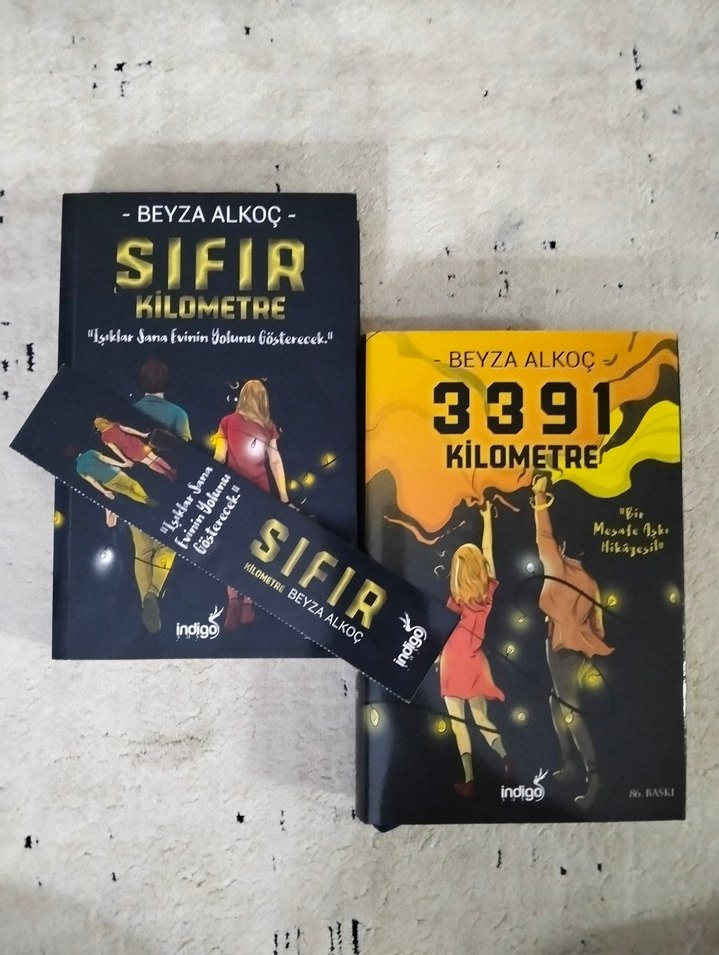 Beyza Alkoç'un 'Sıfır Kilometre' ve '3391 Kilometre' adlı roman seti. 1. kitap ciltsiz 2. kitap ciltli. İçinde 1 ayraç bulunmakta. 2. kitabin ciltinde ufak bir hasar var.