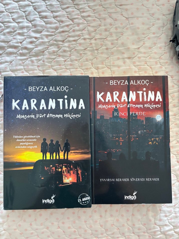 Beyza Alkoç'un "Karantina" roman seti, karantina sürecinde dört kişinin hikayesini anlatıyor. Kapaklarda şehir silüetleri ve insan figürleri yer alıyor. Tertemiz