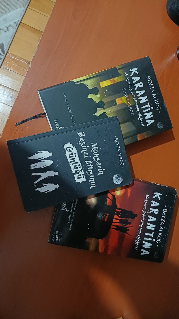 Beyza Alkoc'un 'Karantina', 'Mahserin' ve diğer romanları, koyu kapaklarıyla dikkat çekiyor.