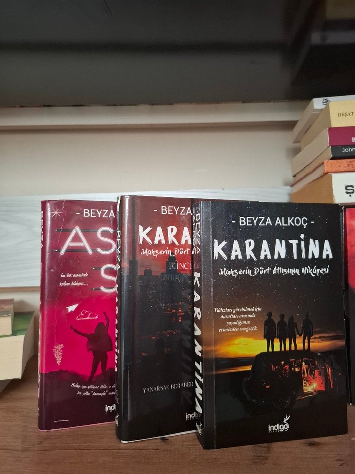 Beyza Alkoç'un Karantina 1 ,2 ve asansör adlı romanlarından oluşan üçleme, duygusal yolculukları anlatıyor. asansör kitabının cildi kapağa yapışık. Diğer karantina kitapları yeni 2. kitabı ciltli.