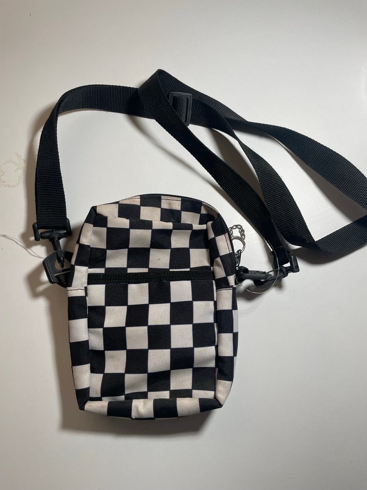 Kadınlar için kareli siyah beyaz desenli, tokalı askılı, sentetik kumaştan yapılmış günlük sokak stiline uygun çapraz çanta.