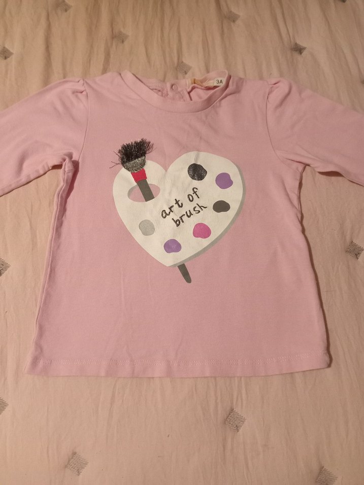 BG 3 yaş,Pamuklu, pembe, uzun kollu kız çocuk tişörtü. Önünde kalp şeklinde fırça ve boya paleti baskısı bulunur. herhangi bir deformasyonu yoktur şimdiden alıcısına güzel günlerde kullanması dileğimle...