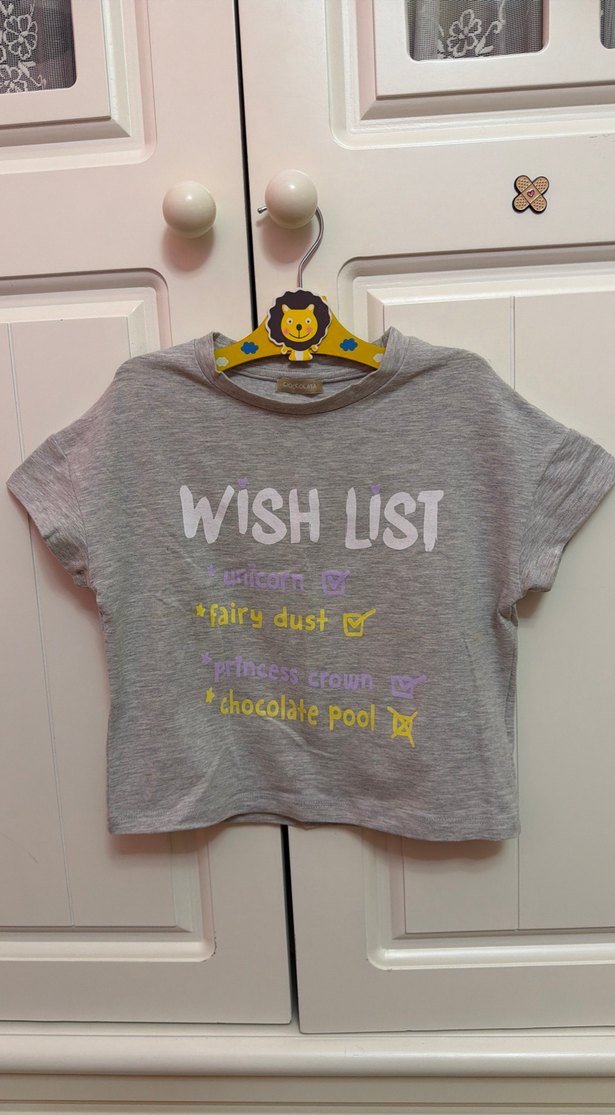 Gri renkli kız tişörtü, kısa kollu ve salaş kesimlidir. Yumuşak sentetik kumaştan üretilmiş olup, renkli "WISH LIST" ve "fairy dust" yazılı baskıya sahiptir.