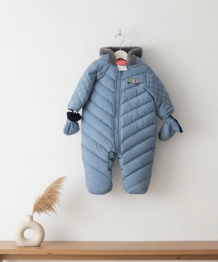 Yumuşak ve sıcak kumaştan yapılmış, kürklü detaylı gri bebek tulumu. Kapüşon ve eldivenleri ekstra konfor sağlar. 6.9 ay - pembe ve mavi renkler