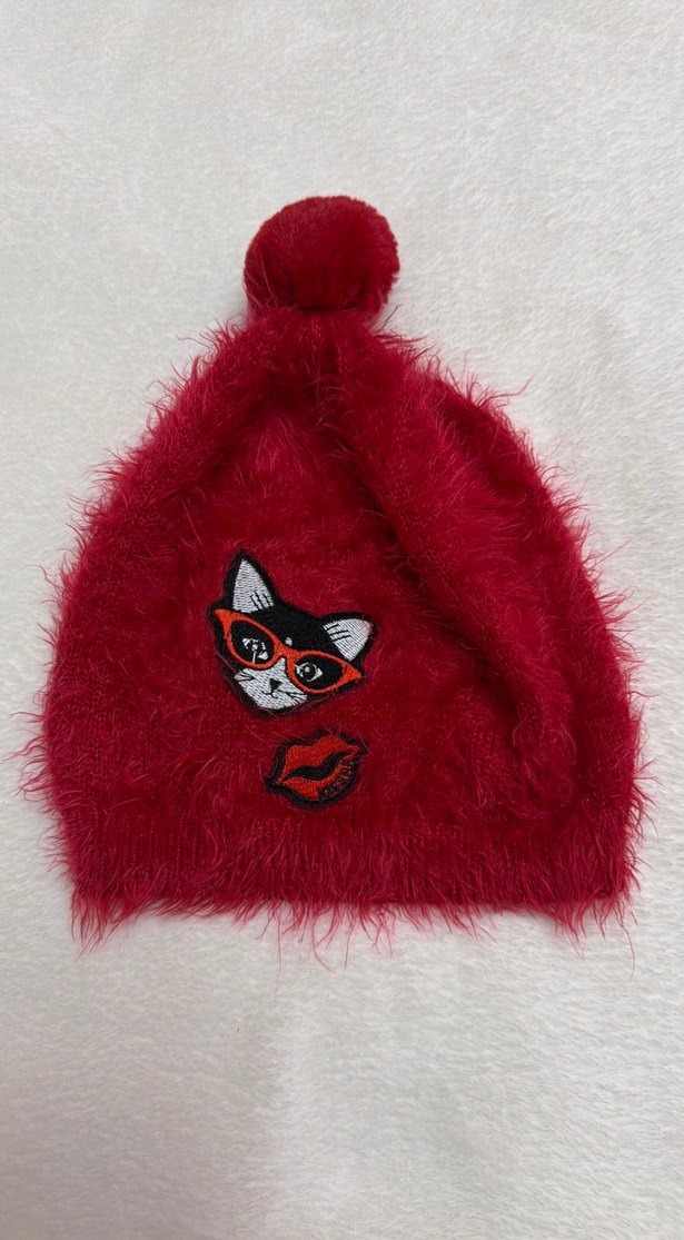 Renkli kırmızı örgü bere, kürk detaylı ve gözlük takan kedi ile öpücük desenli patch ile bohem ve retro tarzı yansıtır. Takımı olan atkıda sayfamızda satıştadır.