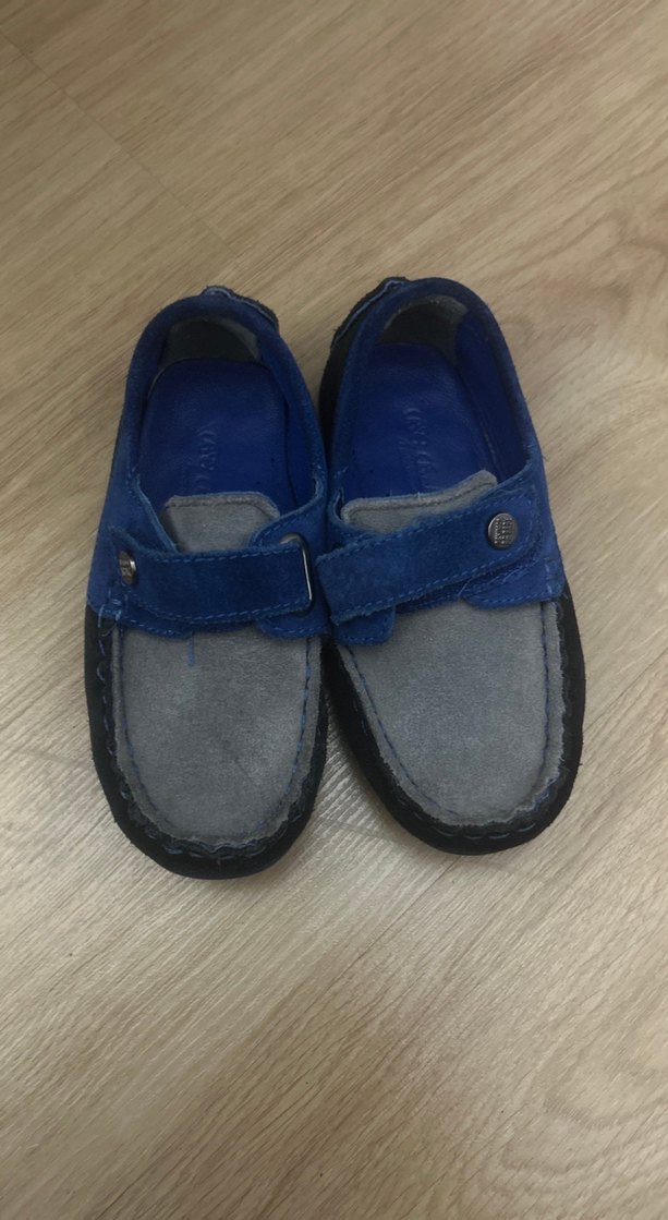 Mavi ve gri süet tokalı erkek ayakkabısı, rahattır. Çok şık duruyor