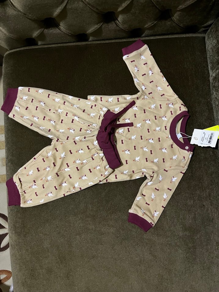 3 aylık için hiç giyilmedi etiketi üzerinde hediye paketli gönderilecektir. Organik ipliklerden yapılmıştır organik bir üründür. Bordo krem renkli olup leylek desenlidir. Yakası çıtçıtlıdır. Kız erkek ıcın uygundur renkleri