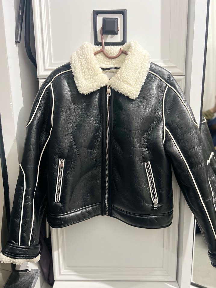 Kürk detaylı, suni deri, siyah biker ceket. Normal midi boyda, çıtçıtlı, dar kesim, parlak yüzeyli, günlük kullanıma uygun.