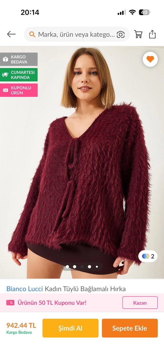 Bordo renkli, uzun kollu, coquette, V yaka, tüylü detaylı, bol kesim kısa boy kadın hırka. Yumuşak örme kumaştan, günlük rahat sokak stili için uygun. Güncel fiyatı 940 tl 4-5 defa giydim sorunsuz. Kilo aldığım için giymek istemiyorum. Son fiyattır. İade kabul etmiyorum şimdiden hayırlı olsun. Marka temsilidir. Asıl markası : Bianco Lucci