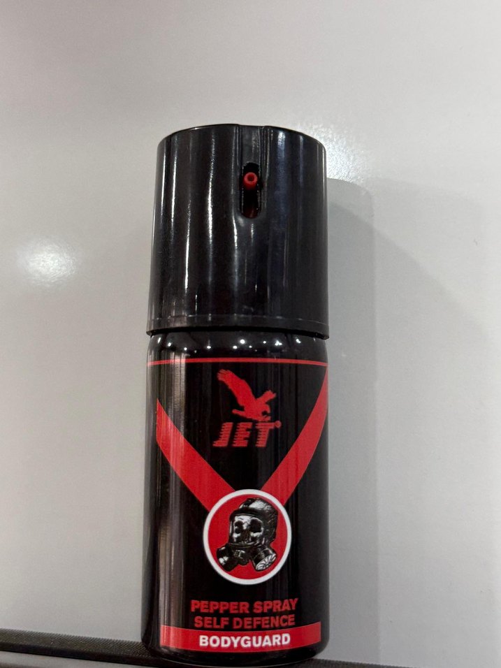 Jet Bodyguard biber gazı spreyi, kendini koruma için tasarlanmış kompakt siyah kutuda, kırmızı detaylı. ️