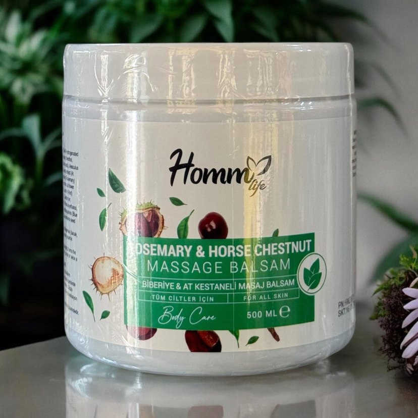 500 ml biberiye ve at kestanesi içeren masaj balsamı, tüm ciltler için uygundur ve masaj sırasında cildi rahatlatır.