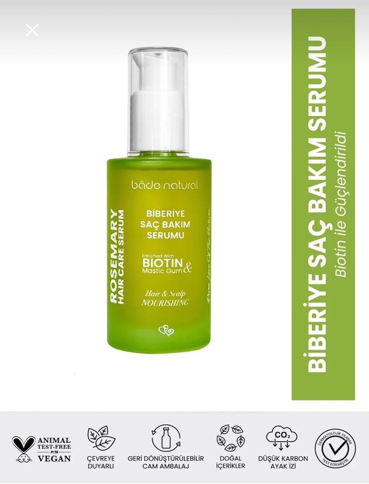 Biotin ve doğal içeriklerle güçlendirilmiş biberiye saç bakım serumu, saçları besler ve güçlendirir. Vegan, çevre dostu ve geri dönüştürülebilir cam ambalajda sunulur.