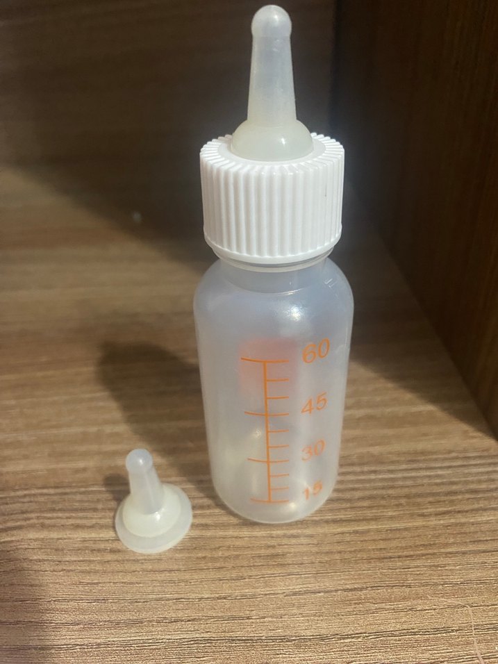 Pastel beyaz renkte, 60 ml kapasiteli, yumuşak silikon emzikli hayvan biberonu. Ekstra küçük emzik kapağı da mevcuttur. Kedim için aldım ama kullanmadım