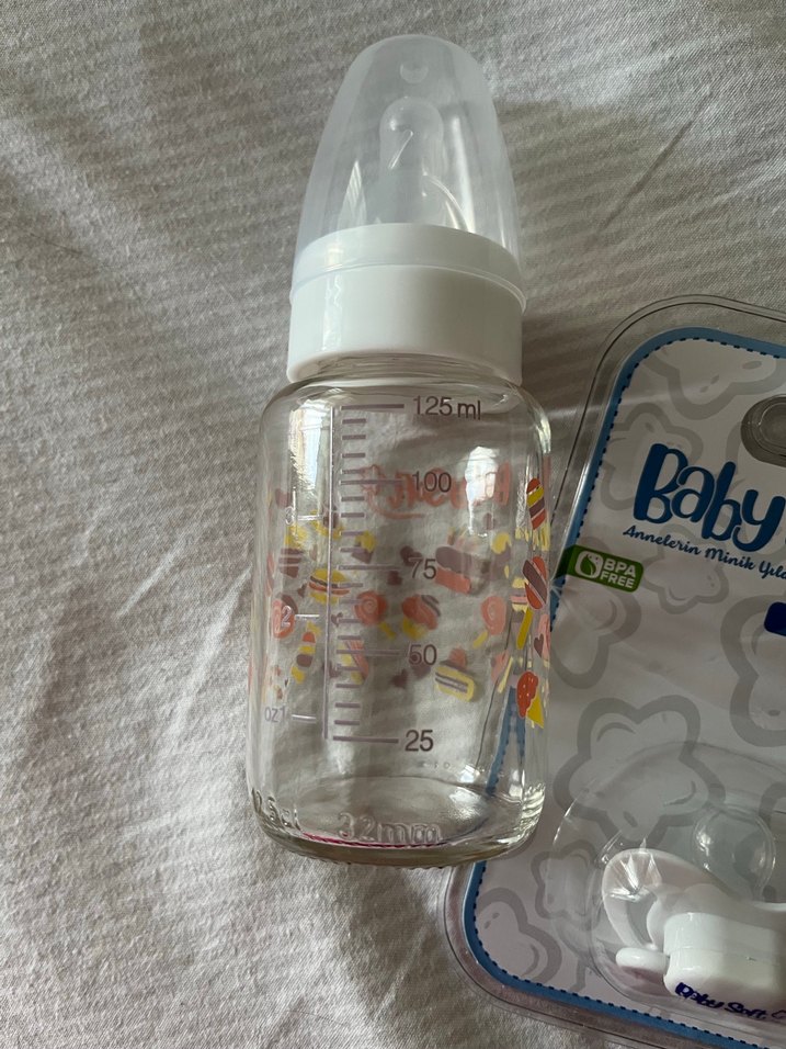 125 ml kapasiteli, pastel beyaz renkte, ölçü işaretli ve BPA içermeyen bebek biberonu. CAM BİBERON DAMAK EMZİK VE TIRNAK MAKASI HİÇ KULLANILMADI PAKETLERİNDE TEMİZ
